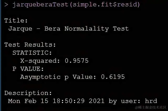 检验结果告诉我们残差确实是正态的。