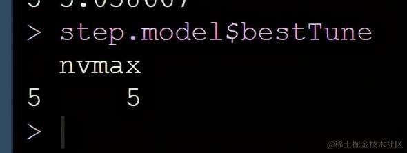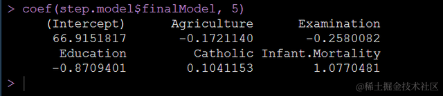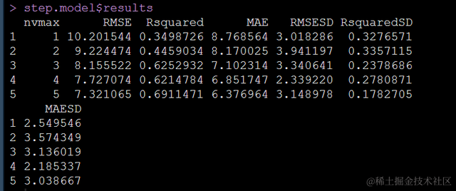 我们需要根据模型的RMSE和MAE对模型进行选择,可以看到模型5的RMSE和MAE是最小的,所以最好的模型就是5个变量都放进去,当然了,你不愿意自己选,也可以直接输出最好的模型: