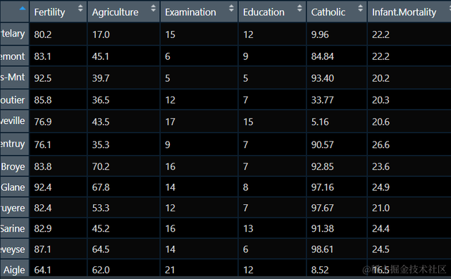 我们用到的数据为R自带的Swiss数据集,里面有6个变量:
