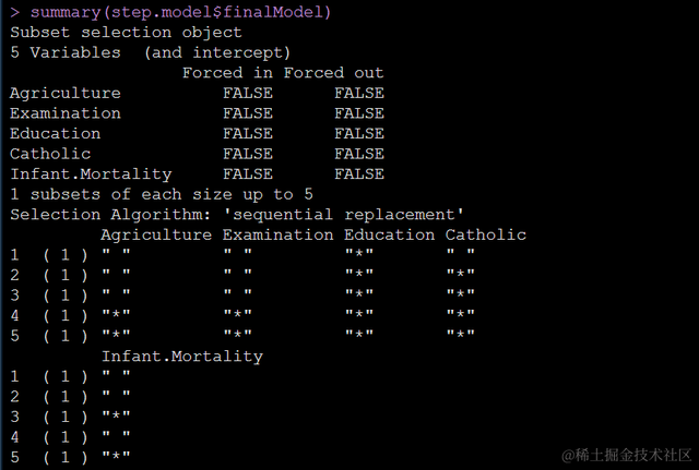 从输出结果可以看到自变量的选择过程,如果只要一个变量那么最好的选择就是Education,如果放两个自变量,那么最好的选择就是Education和Catholic。以此类推。。