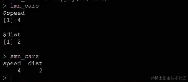 上面的代码中,我把cars这个数据集分别用了lapply和sapply,都是求最小值,看结果: