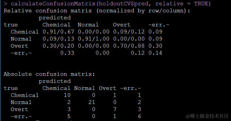 可以看到,我们的混淆矩阵中既有绝对数又有占比,很棒,我刚刚训练的KNN分类错了共5+1+6=11个病人,其中这个KNN模型对overt这一类病人分类效果似乎并不太好。