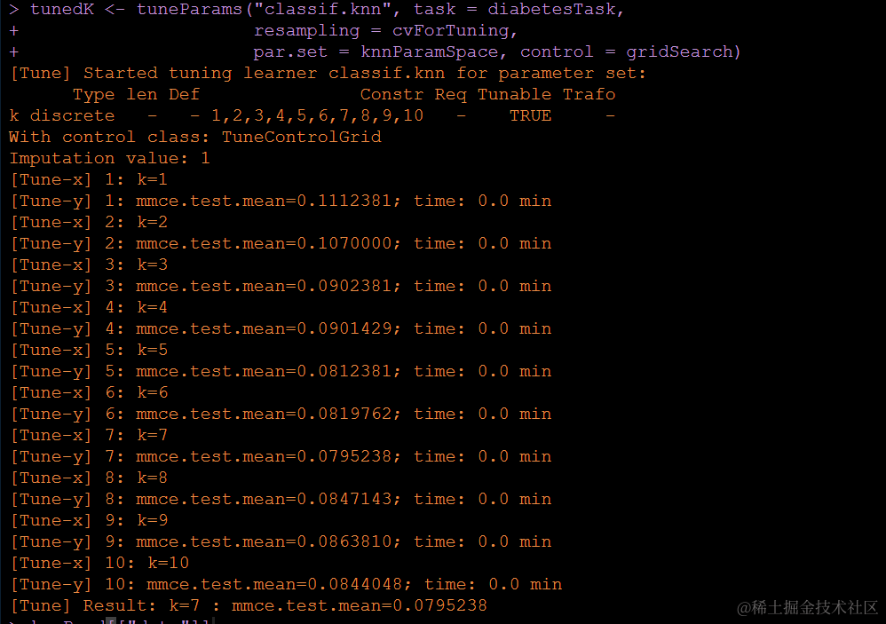 <span style="color:#222222"><code>tunedK <span style="color:#114ba6"><- tuneParams("classif.knn", task = <span style="color:#00753b">diabetesTask,</span>