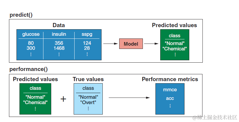 knnPred <- predict(knnModel, newdata = diabetesTib)</code></span>