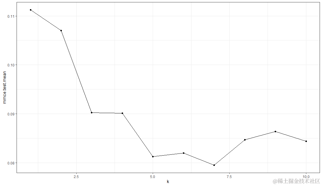 plotHyperParsEffect(knnTuningData, x = <span style="color:#00753b">"k"</span>, y = <span style="color:#00753b">"mmce.test.mean"</span>,