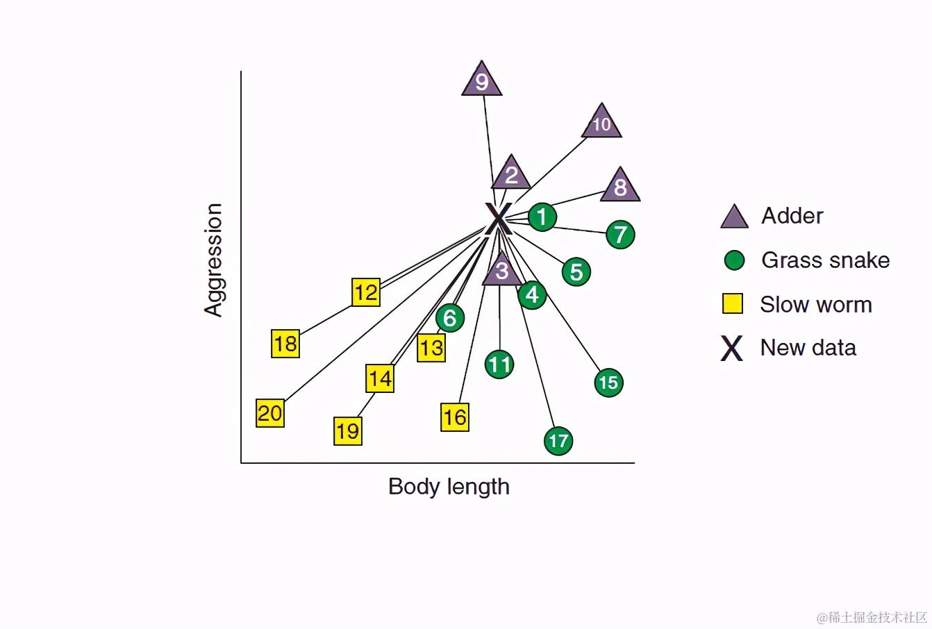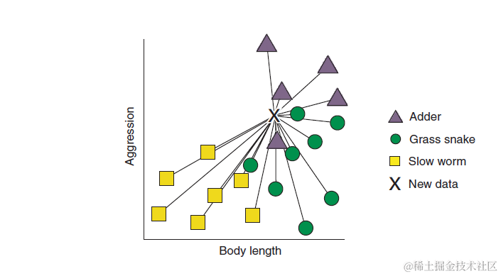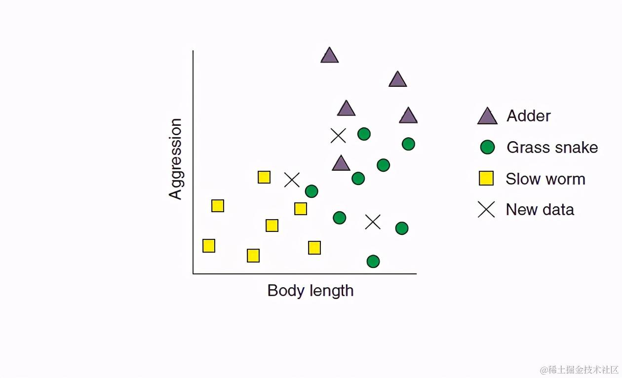 图中有每个爬行动物在身长和攻击性两个维度的值,XX就是待分类的动物的身长和攻击性,我们现在需要用KNN模型去判断这三个X分别是哪一类。