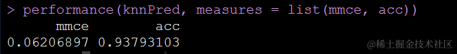 <span style="color:#222222"><code>performance(knnPred, measures = <span style="color:#114ba6">list</span>(mmce, acc))</code></span>