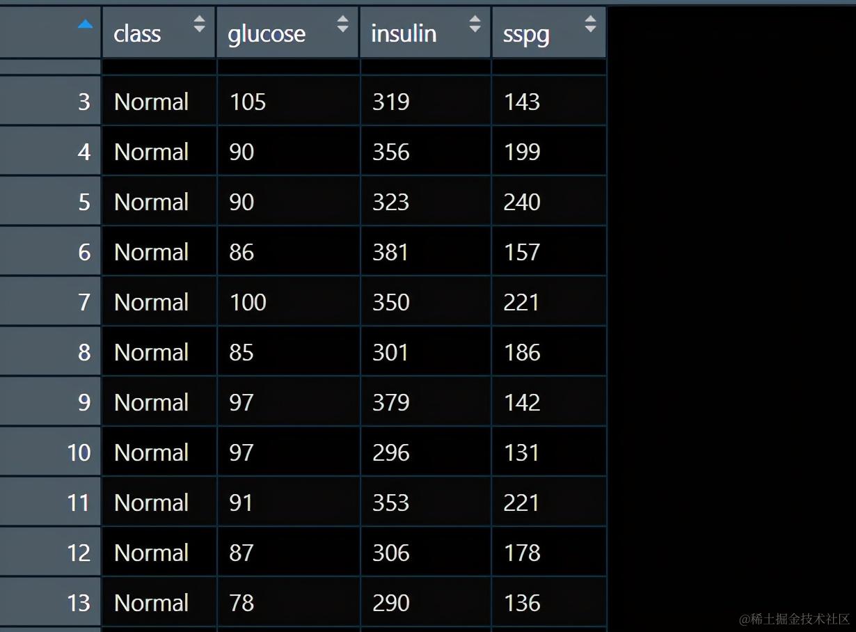 4个变量,第一个变量就是分类结局,取值可以为non-diabetic (Normal),chemically