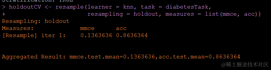 上面的代码中第一个holdout是生存交叉验证的数据集,按照7:3划分,其中令stratify为T保证了类别之间的平衡,第二个对象就是我们在划分出来的训练集中跑的KNN模型。