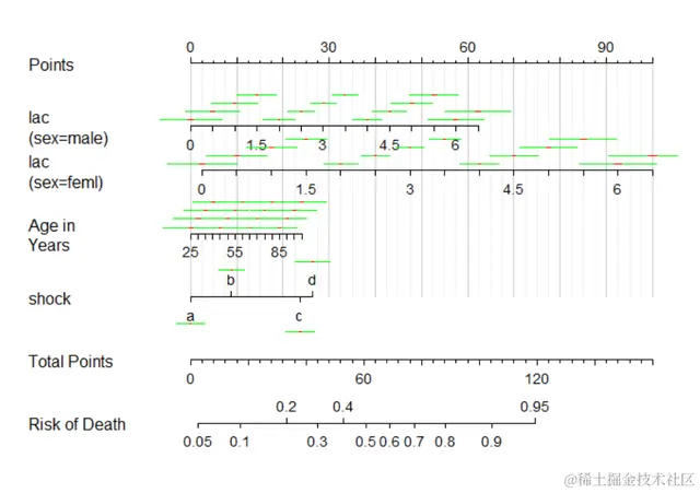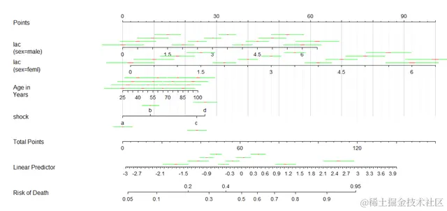 因为我们的模型中是有交互的,是lac和sex交互,其中sex是有两个水平,那么我们出来的列线图就会在sex的两个水平分别画出lac,于是我们做出来的列线图就是下面这个样子的: