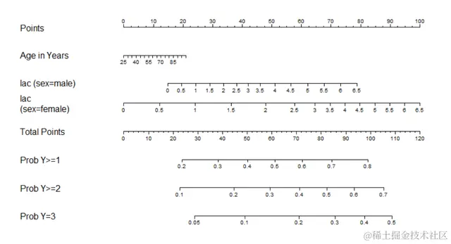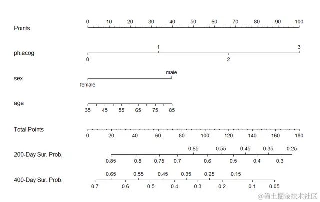 模型拟合好了之后,我们把这个模型直接喂给nomogram函数就行,代码如下: