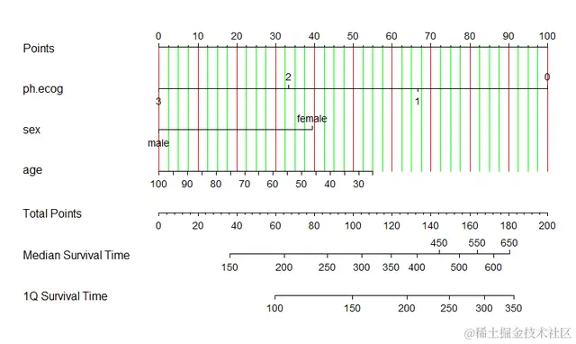 对于生存数据我们可以用半参数模型和参数模型进行建模(见我之前的文章),在生存分析中我们一般会感兴趣特定时点的生存概率和中位生存期,当然啦,这些模型都是可以通过列线图进行可视化的。