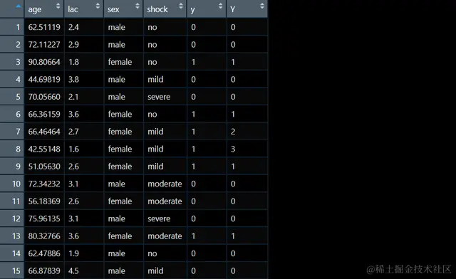 这个数据集有1000个个案,6个变量,其中age和lac都是正态分布的连续自变量,sex和shock为因子,y是二分类结局,Y是多分类结局(3分类),所以我们如果用y做结局,就是拟合一个二分类逻辑斯蒂回归,用Y做结局就是多分类逻辑斯蒂回归。接下来我们一个一个看: