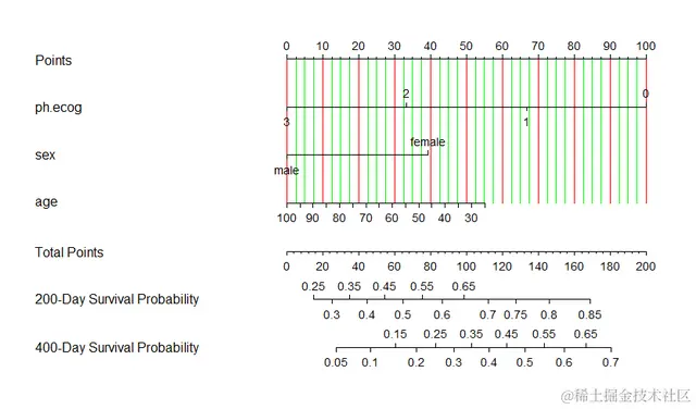 通过上图就可以很方便地得到某个病人200天和400天时的生存概率了,好了,以上就是论文的所有内容,就给大家解析到这儿,希望对做列线图的同学有用。