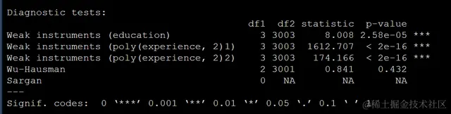 诊断信息中包含3个检验一个是weak instruments,一个是Wu–Hausman test,还有一个Sargan test,一个一个给大家写写是什么意思: