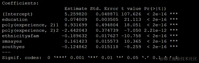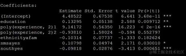 m_ols <- lm(log(wage) ~ education + poly(experience, 2) + ethnicity + smsa + south,