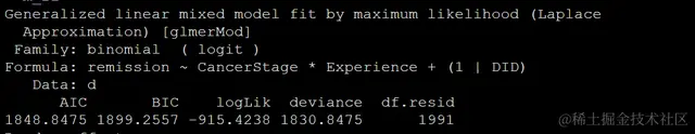 超级简单的一个示例数据哈,其中DID是医生编号,Experience是医生的经验,我现在简单的认为,医生经验和病人病情都会对恢复结局产生影响,我就想跑跑回归看看结果,考虑到数据的嵌套特性我得使用多水平模型,remission是一个二分类变量,于是我们得考虑用多水平的logistics模型。