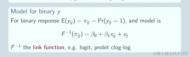 为了更好地帮助大家理解,我们先回顾一下混合效应的一般写法,以随机截距为例子,当我们的因变量是连续的,此时我们可以做混合效应模型,比如我们的随机截距混合效应模型就是如下,其中uj就叫做随机截距(去翻翻之前的文章哈) :