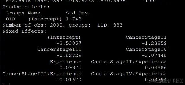 然后对于这么一个随机截距模型,我们有固定效应部分的系数如下表: