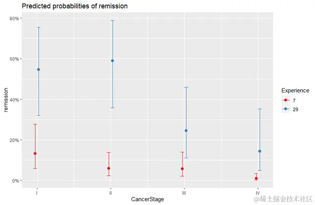 m2 <- glm(remission ~ CancerStage * Experience, data = d, family = binomial)