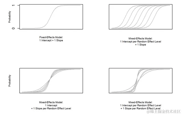左上角就是大家都知道的logistics回归模型,右上角是随机截距logistics模型,左下角是随机斜率logistics回归模型,右下角就是既有随机截距又有随机斜率的logistics模型啦,和之前给大家写的线性混合模型一模一样的。
