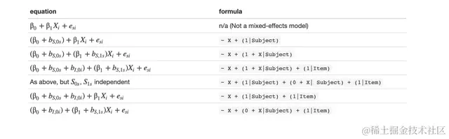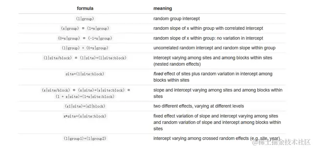 在R语言中具体的随机效应的设定,请大家参考下表(建议大家收藏起来,自己试试哈):