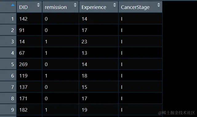 首先还是先介绍一下手上的数据,一个医院不同医生接诊的肺癌患者的数据库,很明显我们知道,病人是嵌套在医生水平的,我现在感兴趣病人病情恢复情况remission的相关因素,包括病人的特征和医生的特征: