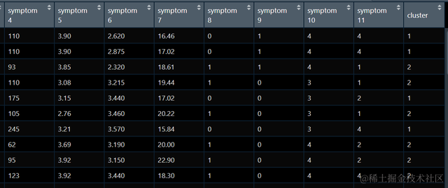 运行上面的代码后我们再查看原来是数据库,就可以看到新生成的最后一列就是每一个个案是症状群类别。然后我们就可以比较不同症状群的个案在各种变量上的差异了,像这样一篇论文也就完成了。