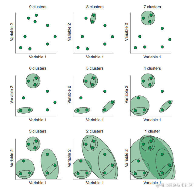 对于这个一个树,英文叫dendrogram,它怎么形成的呢,很自然地,我们可以让其通过从顶部往下散开这样的方式形成(方式1,英文叫Divisive),也可以让其从根部往上聚合这样的方式形成(方式2,英文叫Agglomerative)。