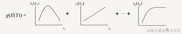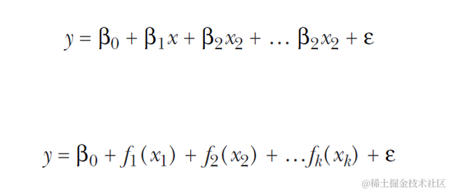 上面写的内容,无论是直接拟合,还是分段拟合,我们都是在拟合一个完整的曲线或直线方程,广义可加模型则是将自变量的单独模型相加,下图式子即为一般线性模型和可加模型: