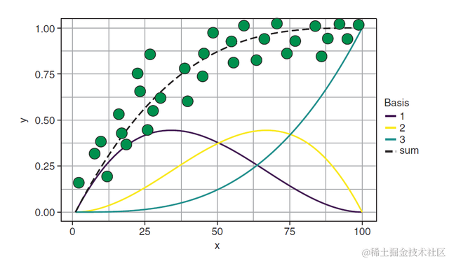 我们看下图,下图中对于x和y关系的拟合是通过x的3个基础函数相加得到的: