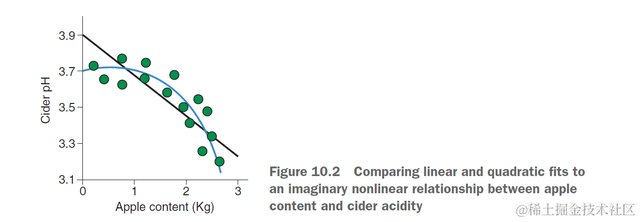 首先看一个二次项拟合的例子,我现在想探讨苹果内容物apple content和苹果酸度cider acidity的关系,第一步应该是做出apple content和cider acidity关系的散点图,假如是下图: