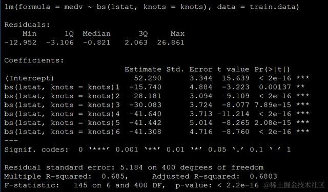 model <- lm (medv ~ bs(lstat, knots = knots), data = train.data)