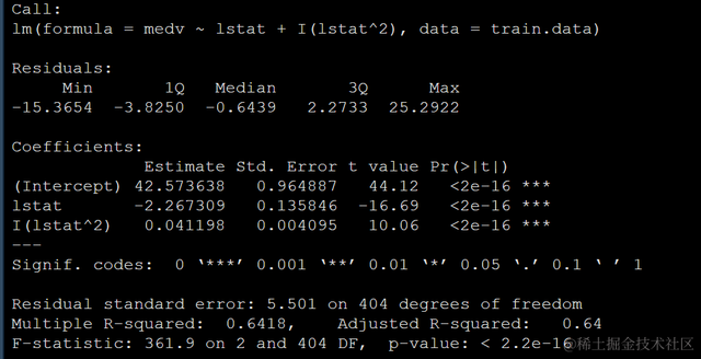 lm(medv ~ lstat + I(lstat^2), data = train.data)