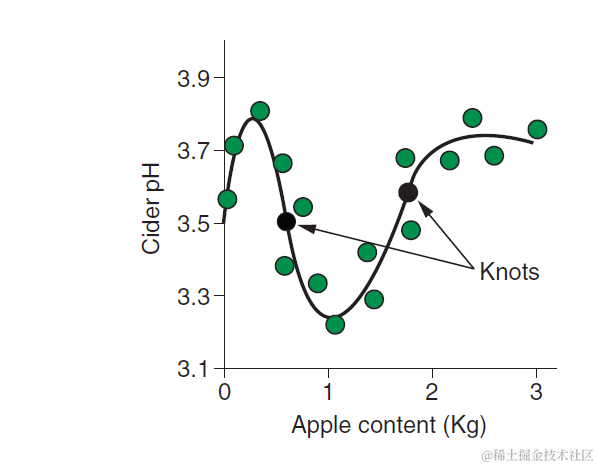 所谓样条就是成片段的多次式,一个曲线分多段拟合,段与段之间的分割点叫做结knots