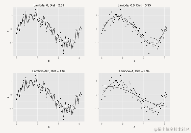 正则化则可以避免过拟合,可加模型是有一个超参λ的,这个超参决定了曲线的歪扭程度,英文叫做wiggliness,通过对超参的控制就可以很方便地实现方差偏差折中,见下图: