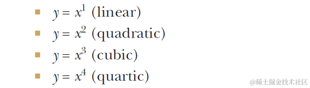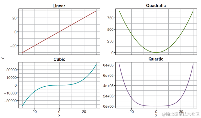 上面的只是一个2次项拟合的例子,我们其实经常会遇到有可能高次式会把数据拟合的更好,社科论文中其实也常常见到做高次回归的,常见的1次,2次,3次,4次项英文论文中的表达,曲线形状如下: