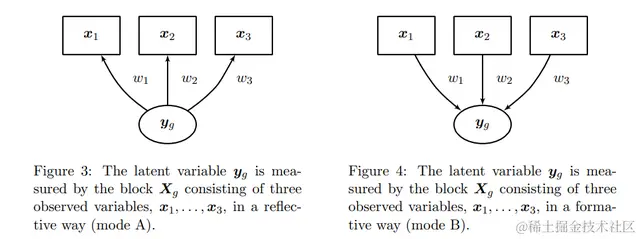与CBSEM不同,PLSSEM的测量模型又可以分为两种,一种是reflective measurements,叫做反映型测量模型,另外一种叫做构成型测量模型formative measurements