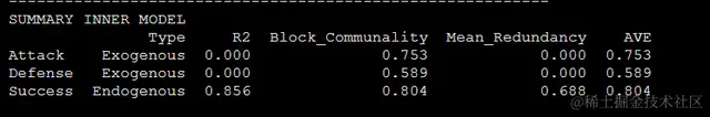 到这儿,一篇博士学位论文中的PLSsem分析部分就算完成了,其实R的结果中还有R方,总效应和效应分解等等如下,也可以选择性报告: