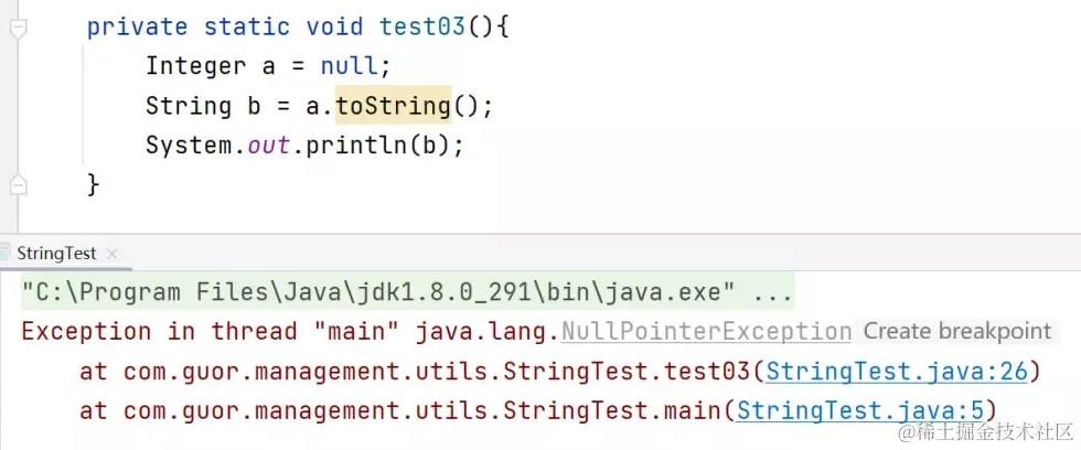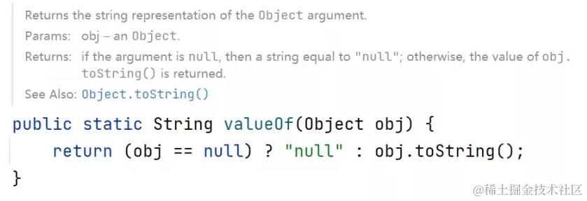 在这种使用方法中,因为java.lang.Object类里已有public方法.toString(),所以java对象都可以调用此方法。但在使用时要注意,必须保证object不是null值,否则将抛出NullPointerException异常。采用这种方法时,通常派生类会覆盖Object里的toString()方法。 - String.valueOf() ,推荐使用,返回字符串“null”