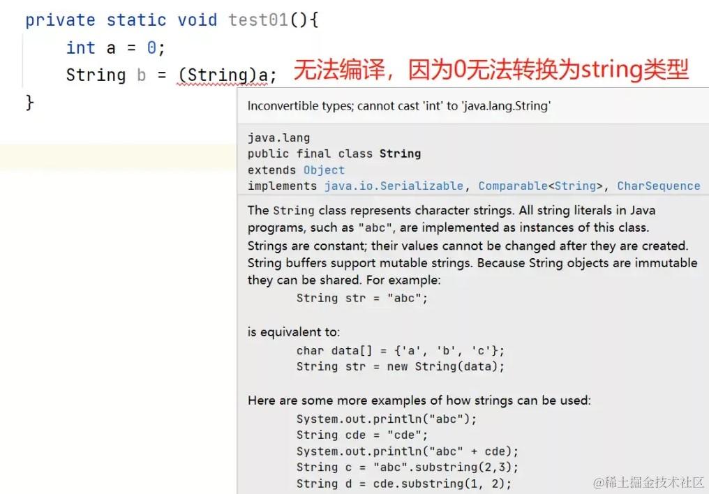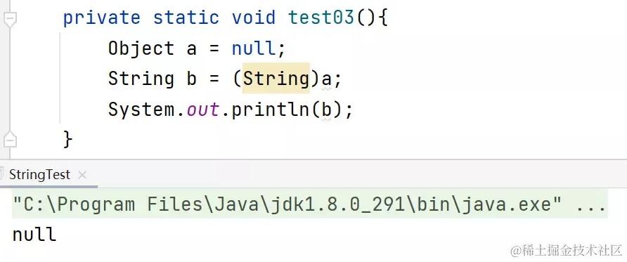 String.valueOf()不会出现空指针异常,而且是静态的方法,直接通过String调用即可,需要注意的是,如果为`null,String.valueOf()返回结果是字符串“null”。而不是null。 - (String)强转,不推荐使用