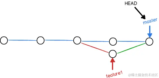 现在,master分支和feature1分支变成了下图所示: