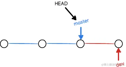 当创建新的dev分支时,Git新建了一个指针叫dev,指向master相同的提交,再把HEAD指向dev,就表示当前分支在dev上: