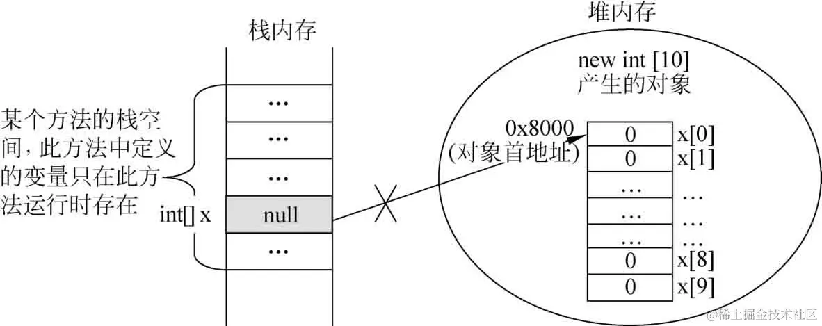 执行完“x = null;”语句后,原来通过new int[10]产生的数组对象不再被任何引用变量所引用,变成了所谓的“垃圾”,直到垃圾回收器来将它释放掉。