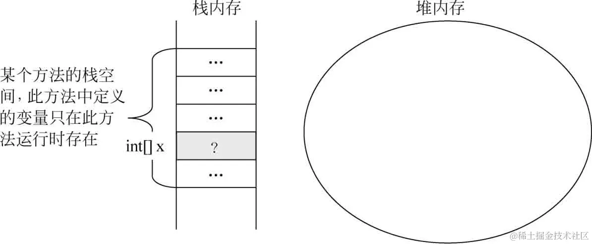 在方法中定义的一些基本类型的变量和对象的引用变量都在方法的栈内存中分配,当在一段代码块中定义一个变量时,Java就在栈内存中为这个变量分配内存空间,当超出变量的作用域后,Java会自动释放掉为该变量所分配的内存空间,该内存空间可以立刻被另作他用。