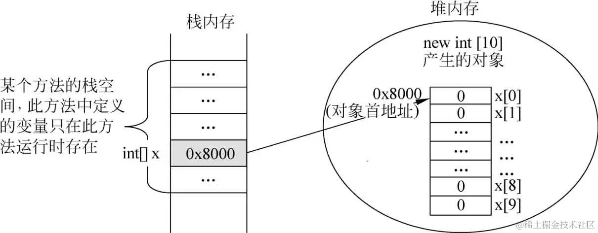 等号左边的 “int [] x ”相当于定义了一个特殊的变量x,x的数据类型是一个对 int 型数组对象的引用,x就是一个数组的引用变量,其引用的数组元素个数不定。等号右边的 “new int[10]” 就是在堆内存中创建一个具有10个int型变量的数组对象。其意义就是将右边的数组对象赋值给左边的数组引用变量。