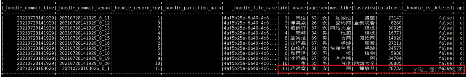 Mysql增加操作对应spark中hudi表查询结果: