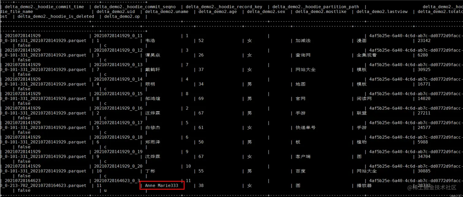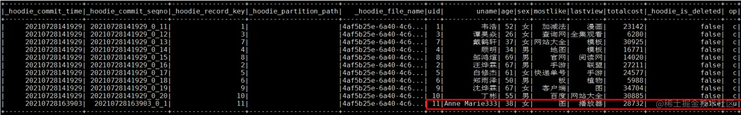 更改操作: UPDATE hudi.hudisource3 SET uname=‘Anne Marie333’ WHERE uid=11;