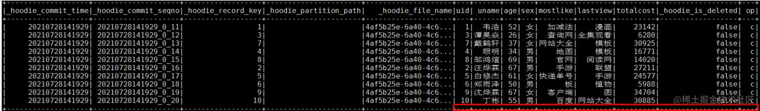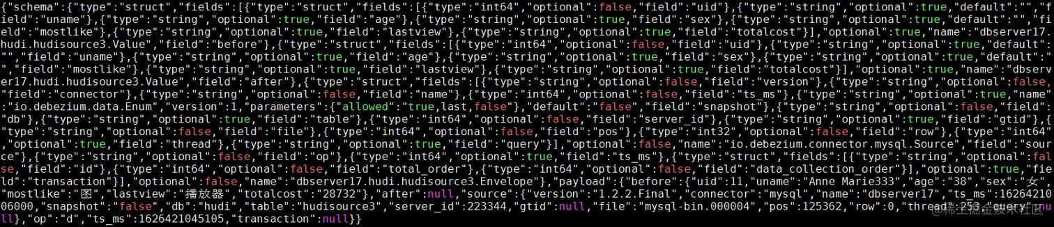 "{\"type\":\"record\",\"name\":\"mytest_record\",\"namespace\":\"hoodie.mytest\",\"fields\":[{\"name\":\"uid\",\"type\":\"int\"},{\"name\":\"uname\",\"type\":\"string\"},{\"name\":\"age\",\"type\":\"string\"},{\"name\":\"sex\",\"type\":\"string\"},{\"name\":\"mostlike\",\"type\":\"string\"},{\"name\":\"lastview\",\"type\":\"string\"},{\"name\":\"totalcost\",\"type\":\"string\"},{\"name\":\"_hoodie_is_deleted\",\"type\":\"boolean\"},{\"name\":\"op\",\"type\":\"string\"}]}");
