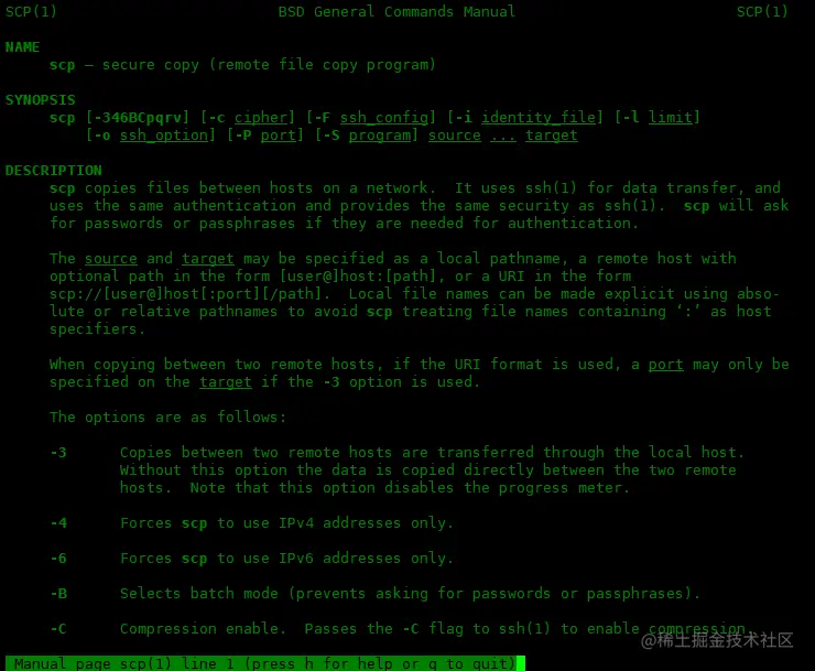 有关使用 scp 命令的更多选项,可以查看手册,命令是:man scp